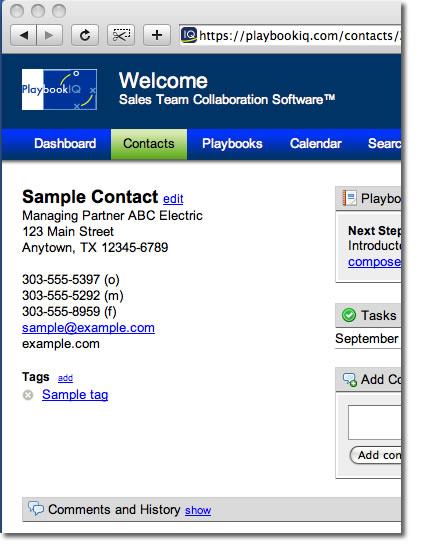 That contact will be assigned to a sample playbook, sample tags and a sample task. Go ahead and click around in the sample contact. Complete a step in the playbook to see how 1) the contact is automatically moved to the next step, 2) a comment is automatically added to history and 3) the user responsible for the next step will see it due on their dashboard and calendar.